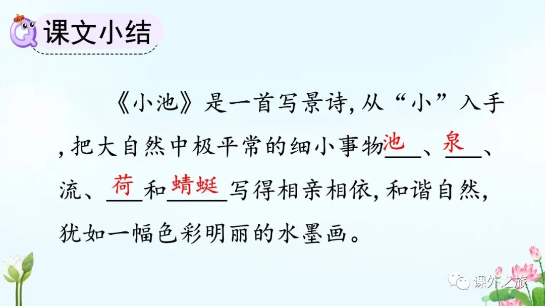 《池上》一诗描写了一个小娃“偷采白莲”的有趣情境,非常接近儿童的生活,符合儿童的心理,充满了童真、童趣。《小池》以清新活泼的语言描写了初夏荷花池的美丽景色,表现了诗人对自然景物的由衷喜爱之情。