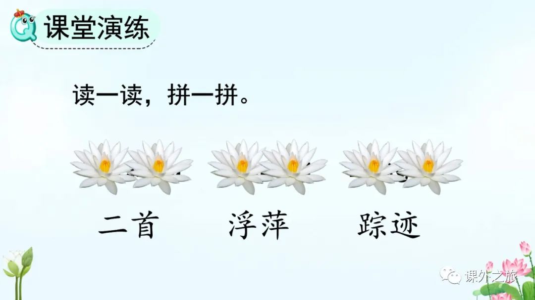 浮萍:水生植物,椭圆形叶子浮在水面,叶下有须根,夏季开白花。