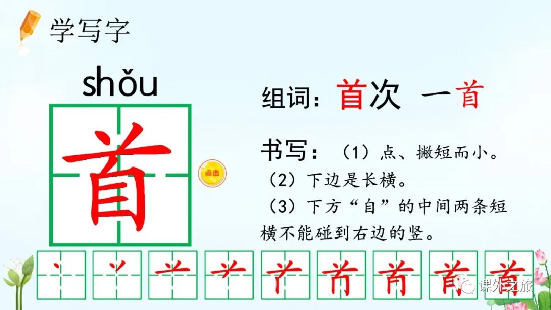 首:下边是“自”,不要写成“白”。
