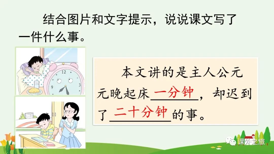 课文写元元因为多睡了一分钟,结果带来了一路的等待和叹息,迟到了20分钟。这个故事告诉我们要珍惜时间,分秒必争。