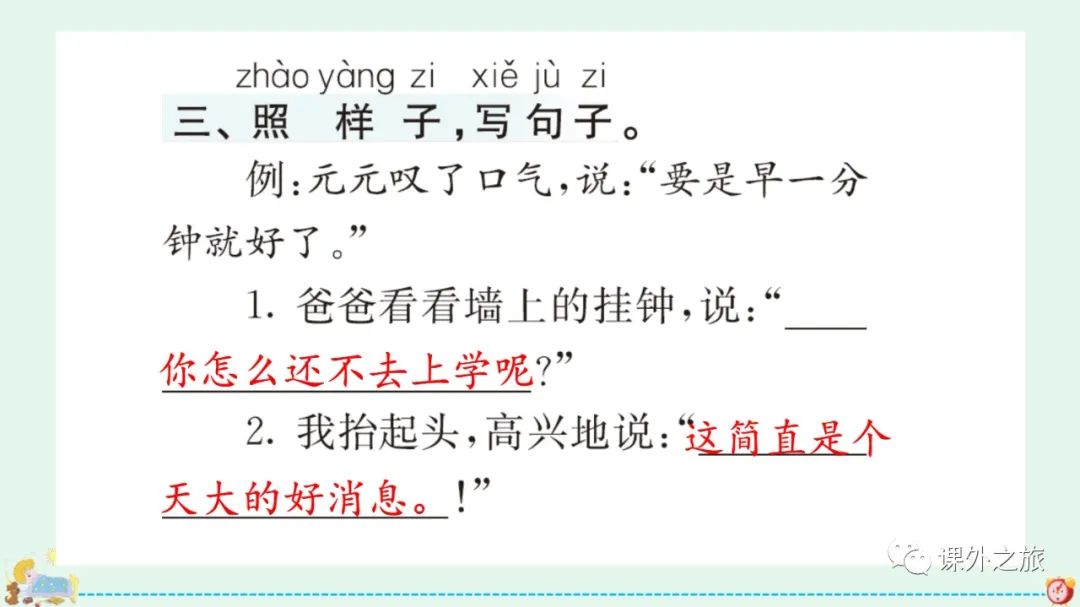 1.丁零零,闹钟响了。元元打了个哈欠,翻了个身,心想:再睡一分钟吧,就一分钟,不会迟到的。