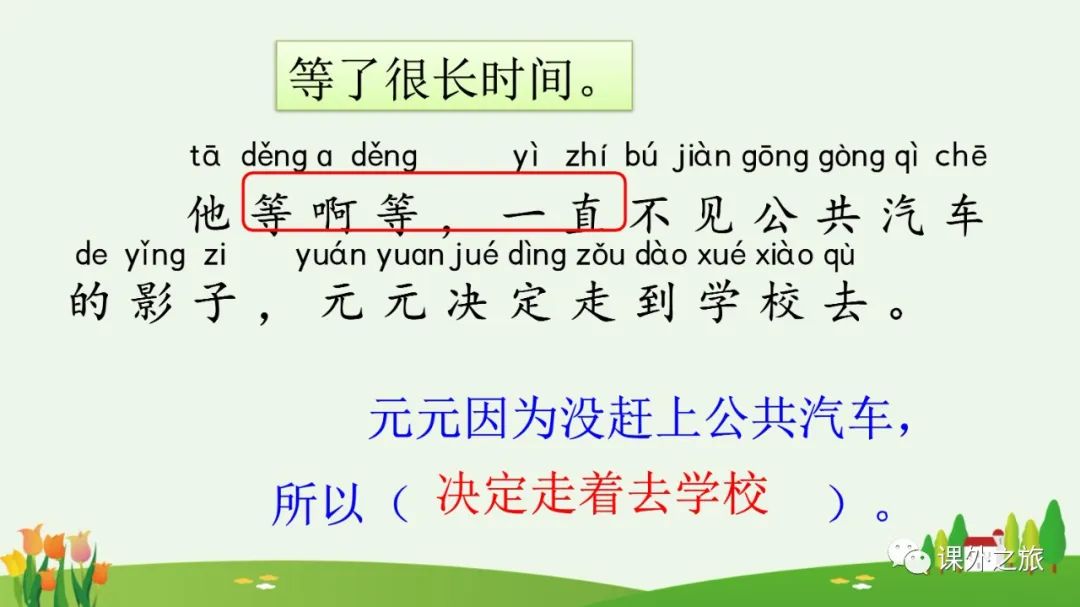 元元虽然只多睡了一分钟,但是在过马路时,因为差一分钟而错过了绿灯,耽误了时间,所以到车站时,公共汽车走了。等不到车,元元只好步行到学校,比坐车多用了很多时间,所以迟到了二十分钟。