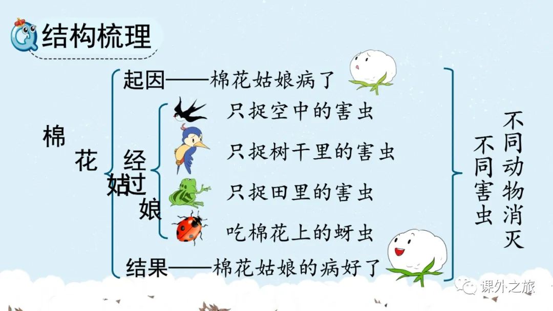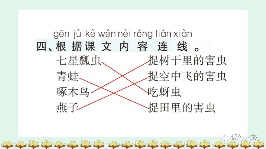 三、七星瓢虫捉棉花叶子上的害虫 啄木鸟捉树上的害虫 青蛙捉田里的害虫 燕子捉空中的害虫