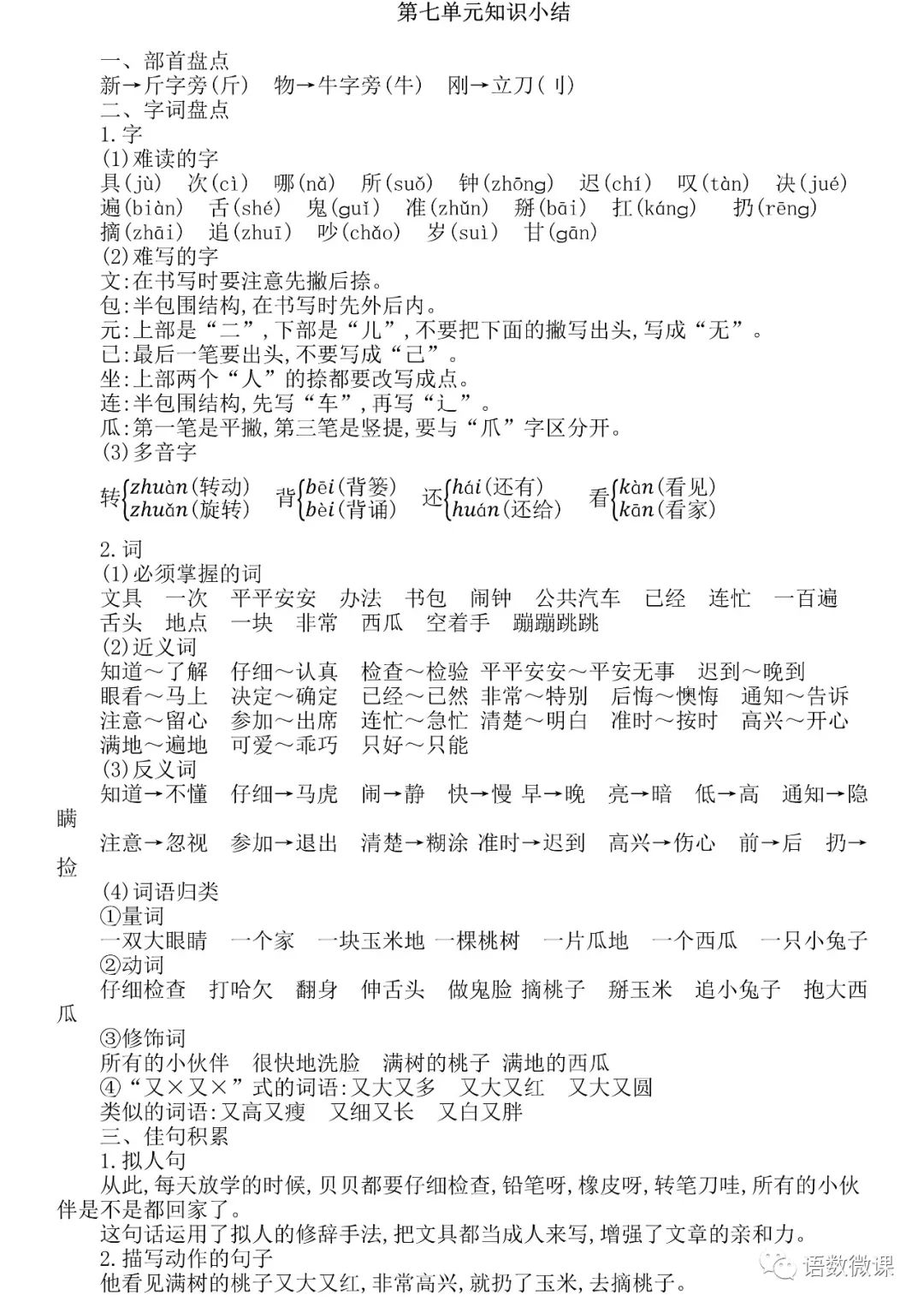 统编版语文一年级(下册)第七单元知识小结及考点清单...