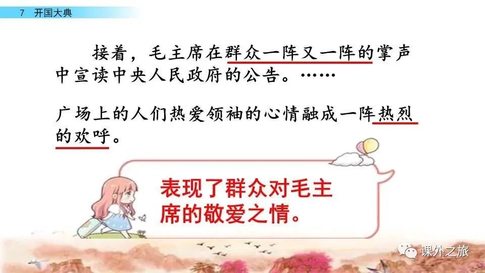典礼临近开始,这种激动、兴奋、自豪的感情表现得越发强烈。当毛主席出现在主席台时,“会场上爆发出一阵排山倒海的掌声”,“三十万人的目光一齐投向主席台”,由此表现了人民对领袖的无比爱戴,对新中国的无限热爱。当毛主席宣布“中华人民共和国中央人民政府今天成立了”之后,课文用“这庄严的宣告,这雄伟的声音”这样的句子,表达全场三十万人以及全国人民为新中国诞生欢欣鼓舞的心情。当第一面五星红旗升起的时候,“三十万人一齐脱帽肃立,一齐抬起头,瞻仰这鲜红的国旗。”激动、自豪的感情溢于言表。
