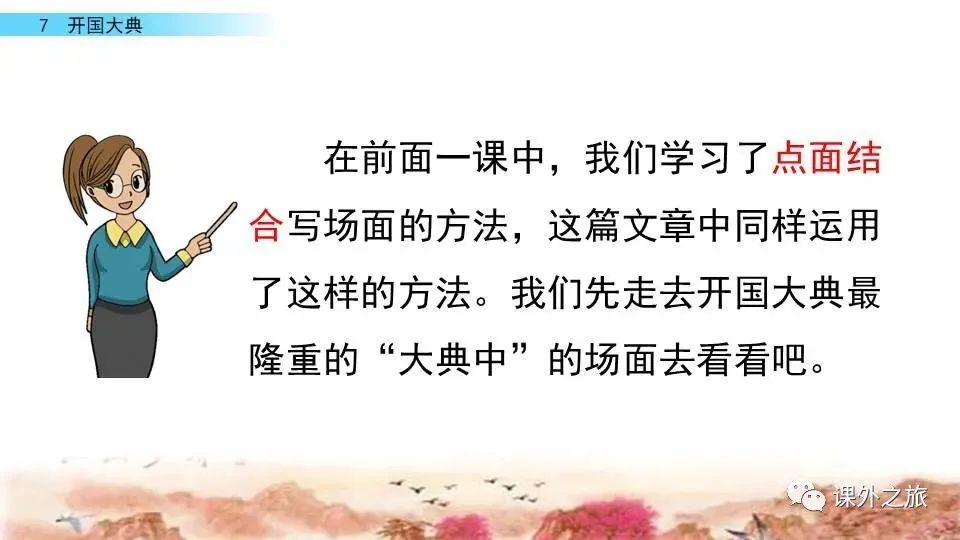 课文的一个个场面描写中,对毛主席的直接描写虽然不多,但很典型。毛泽东宣布中华人民共和国中央人民政府今天成立了”“不断地向群众挥手”,通过这些言行的描写、会场环境的描写及人们激动心情的描写,我们能感受到这位领抽的伟大形象。