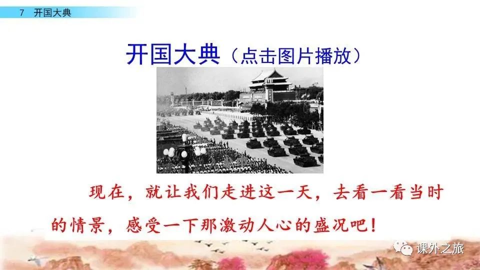 《开国大典》记叙了1949年10月1日在首都北京举行开国大典的盛况,揭示了中华人民共和国成立的伟大历史意义,表达了中国人民对新中国的诞生无比自豪、激动的感情。