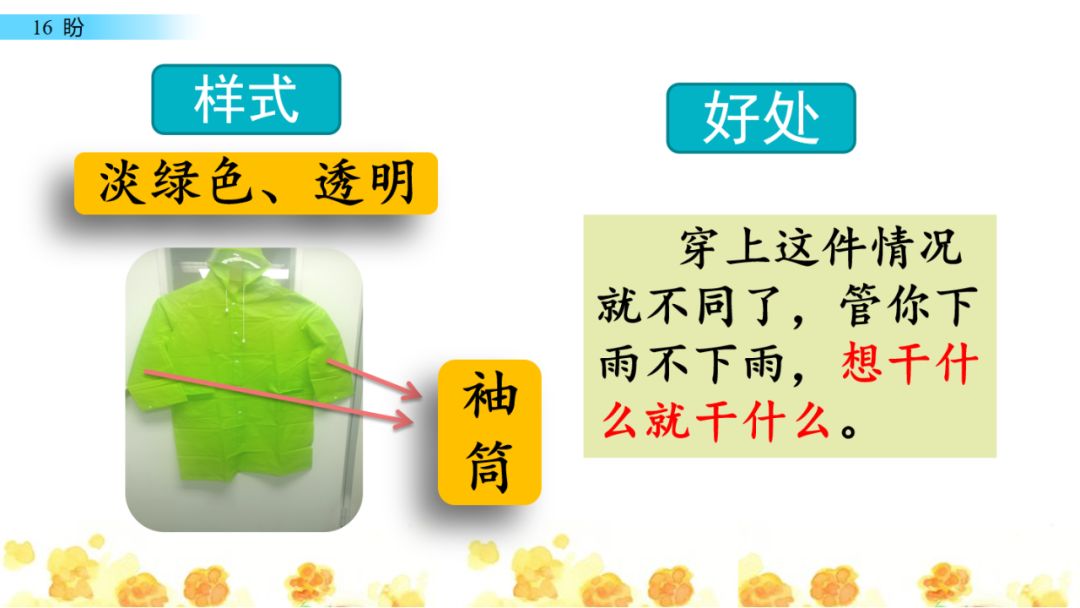 第三部分(16-17):写晚上雨停了,“我”一心想着明天雨点儿打在雨衣上。