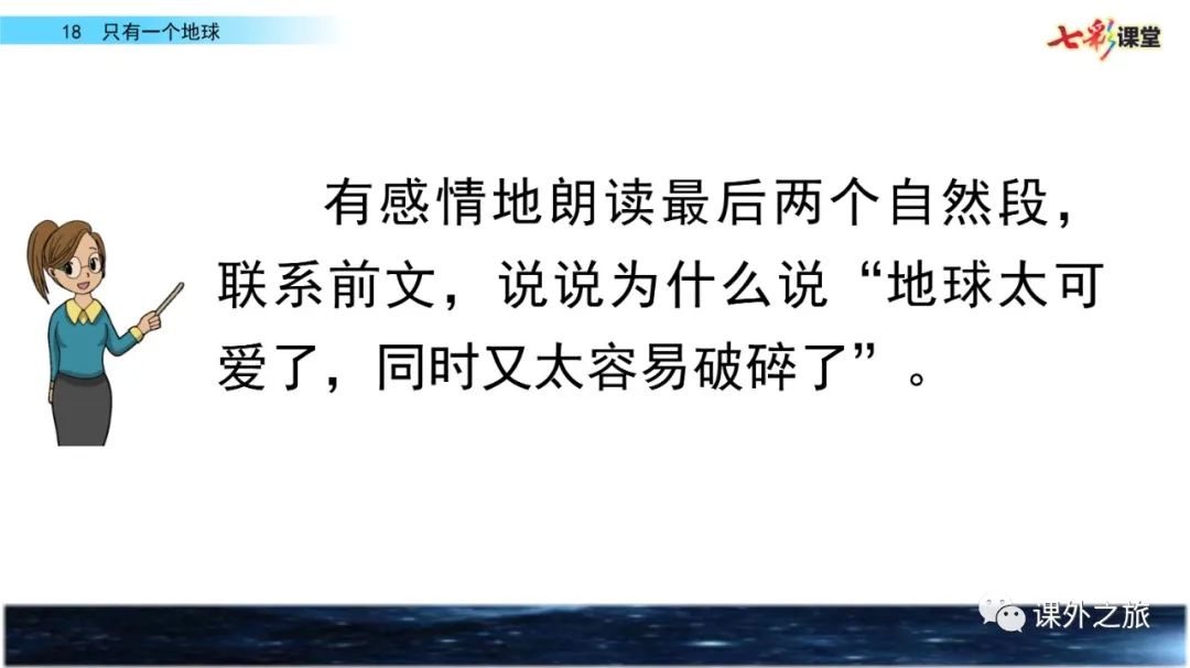 课文采用了列数字、举例子等多种说明方法,介绍了地球的多方面知识,有力地说明了“只有一个地球”的事实。课文语言准确、严谨,用词精当、贴切,体现了严谨的科学态度。如,“人类生活所需要的水资源、土地资源、生物资源等,本来是可以不断再生长期给人类作贡献的”,其中的“本来”强调了这些资源原先的可再生性,因“随意破坏后现在的不可再生性。再如,“科学家已经证明,至少在以地球为中心的40万亿千米的范围内,没有适合人类居住的第二个星球”,其中的“40万亿千米”以列数字的方式,一方面直观地表明了范围之大,大到人类根本无法到达,另一方面也说明“40万亿千米”以外的情况还不能确定。同时,文中还多处采用比喻、拟人等手法,体现了语言的生动、形象。如,“地球,这位人类的母亲,这个生命的摇篮,是那样美丽壮观,和蔼可亲。”将地球比作“母亲”“摇篮”,表达上通俗易懂又生动形象,清晰地阐明了地球与人类及万物生存的密切联系。