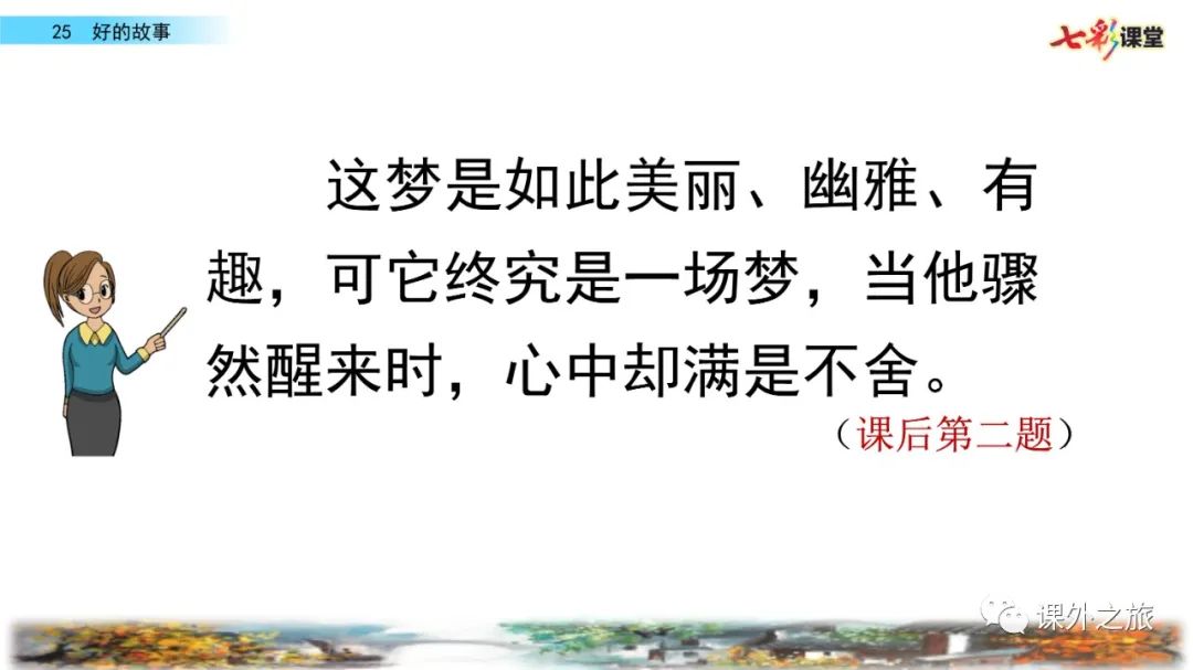 2.”好的故事“其实是一个梦境。这个故事的”美丽,幽雅,有趣“体现在哪里?结合课文内容说一说。