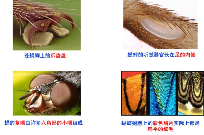 5、通过放大镜能观察到更多关于昆虫的细节。如:苍蝇在竖直光滑的玻璃上不会滑落,这和它脚的构造有关;蝇的眼睛是复眼,每只小眼睛都是六角形;蟋蟀的耳朵长在足的内侧;蝴蝶翅膀上布满的彩色小鳞片,实际上都是扁平的细毛。